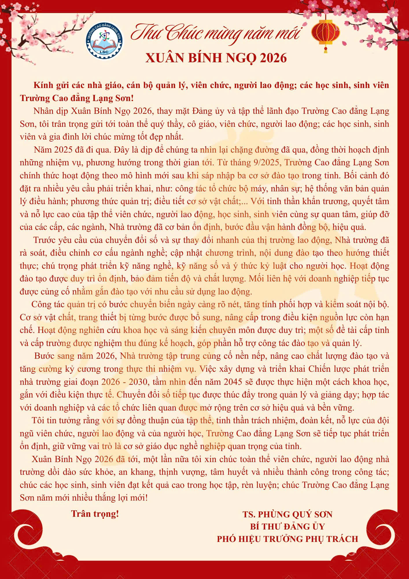 Tối ngày 05/02/2026, Trường Cao đẳng Lạng Sơn đã long trọng tổ chức chương trình “Xuân yêu thương - Tết sẻ chia” mừng Xuân Bính Ngọ 2026 trong không khí rộn ràng, ấm áp và ngập tràn sắc xuân.