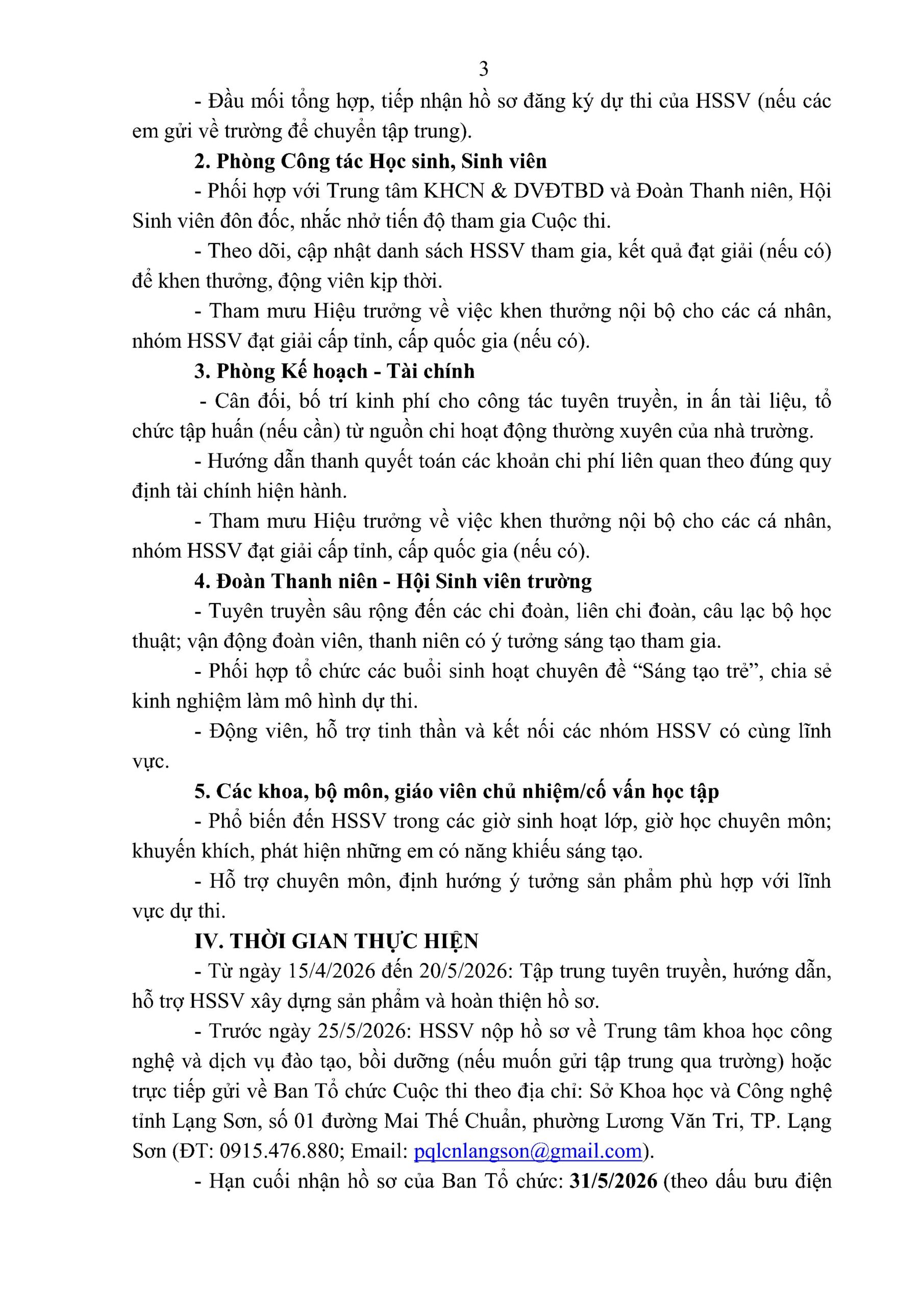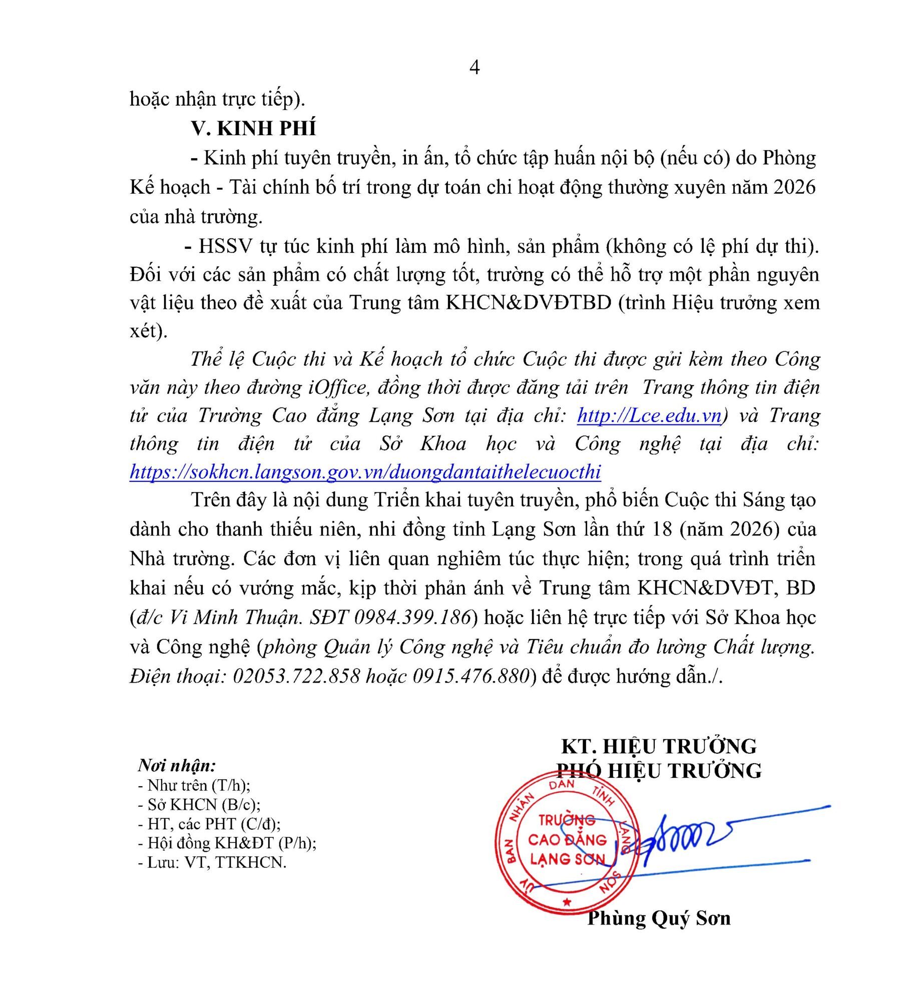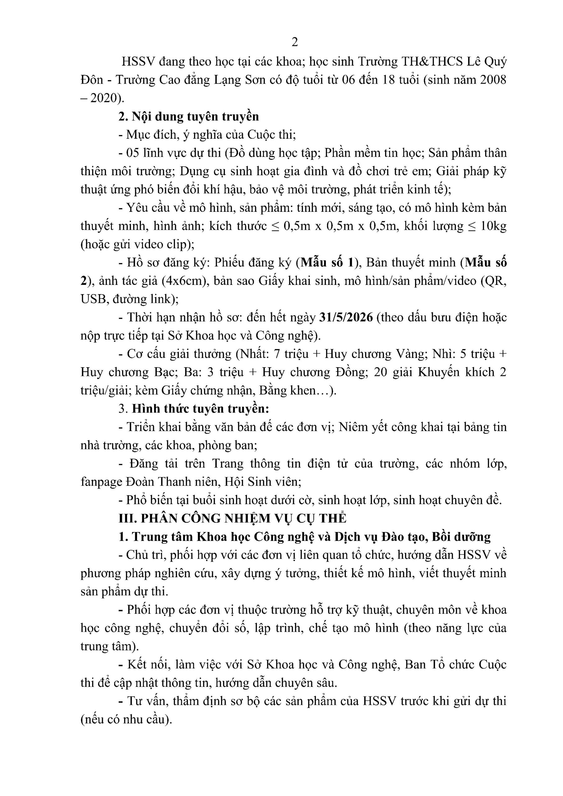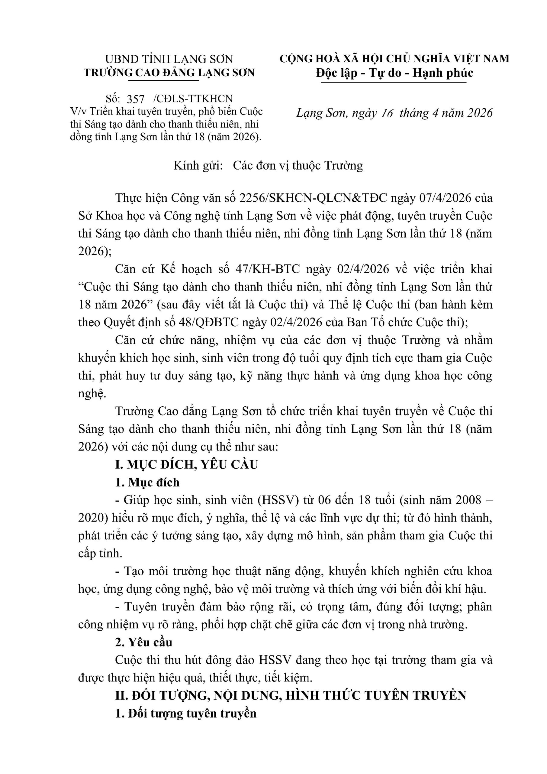 Tin mới Cuộc thi Sáng tạo dành cho thanh thiếu niên, nhi đồng tỉnh Lạng Sơn lần thứ 18 (năm 2026) Trường Cao đẳng Lạng Sơn tổ chức chương trình tham quan, trải nghiệm và hướng nghiệp cho học sinh Trường TH&THCS Tú Đoạn Trường Cao đẳng Lạng Sơn tổ chức Hội nghị Sơ kết công tác khảo thí học kỳ I, năm học 2025-2026 Trường TH&THCS Lê Quý Đôn đạt thành tích cao tại Ngày hội giáo dục STEM phường Lương Văn Tri năm học 2025-2026 Ngoại khóa “Vui học Toán” của Trường TH&THCS Lê Quý Đôn Trang chủKhoa học công nghệCác hoạt động khoa học và công nghệ Cuộc thi Sáng tạo dành cho thanh thiếu niên, nhi đồng tỉnh Lạng Sơn lần thứ 18 (năm 2026) 16/04/2026 0 37 Chia sẻ FacebookXInCopy URL Thể lệ cuộc thi Kế hoạch cuộc thi BÌNH LUẬN Hủy trả lời Bình luận: Vui lòng nhập bình luận của bạn Tên:* Vui lòng nhập tên của bạn ở đây Email:* Bạn đã nhập một địa chỉ email không chính xác! Vui lòng nhập địa chỉ email của bạn ở đây Website: Lưu tên, email và trang web của tôi trong trình duyệt này cho lần tiếp theo tôi nhận xét. Δ Trường Cao đẳng Lạng Sơn tổ chức chương trình... 15/04/2026 Trường Cao đẳng Lạng Sơn tổ chức Hội nghị... 13/04/2026 Trường TH&THCS Lê Quý Đôn đạt thành tích cao... 06/04/2026 Ngoại khóa “Vui học Toán” của Trường TH&THCS Lê... 06/04/2026 Trường Cao đẳng Lạng Sơn tổ chức họp cán... 03/04/2026