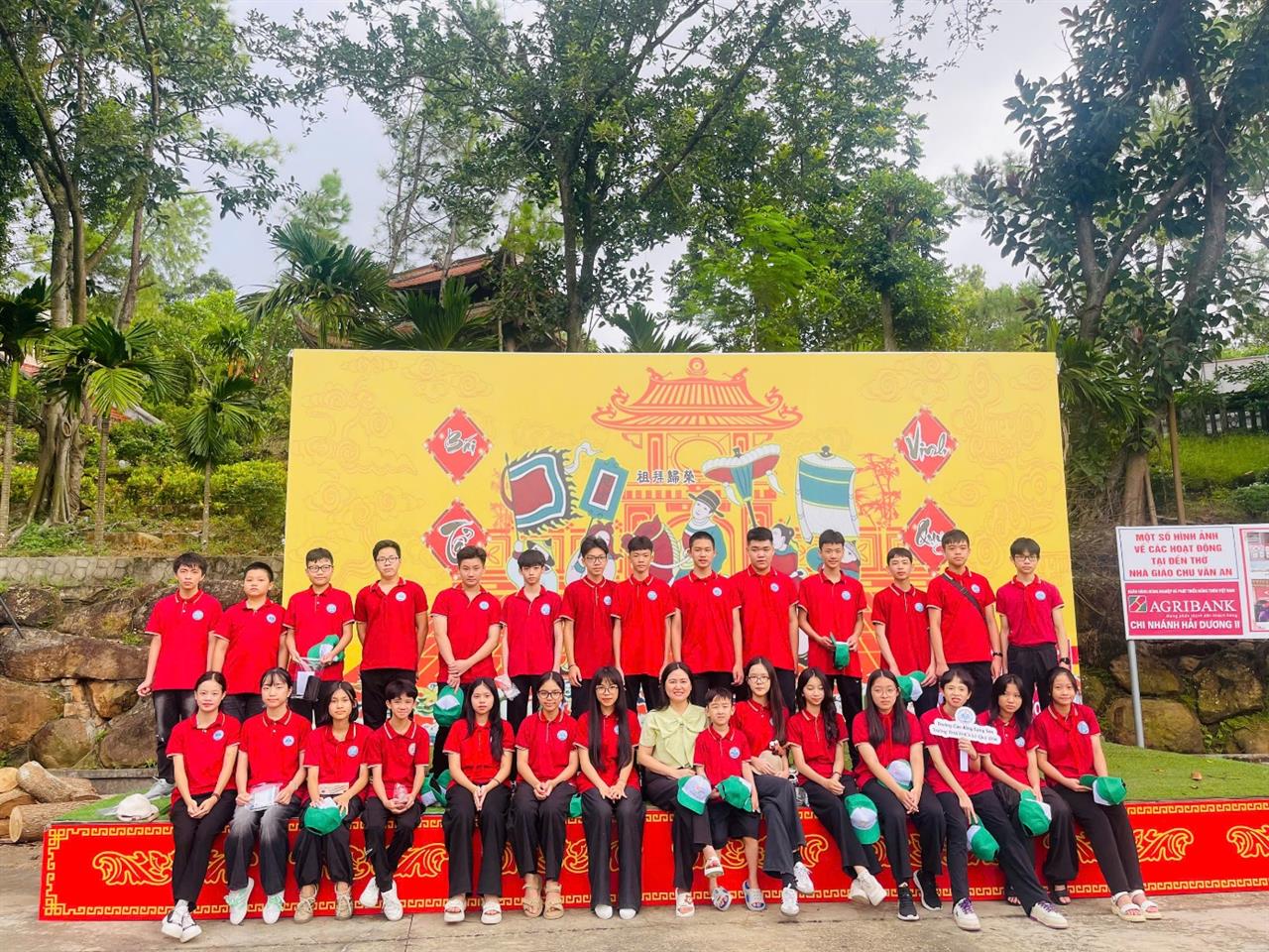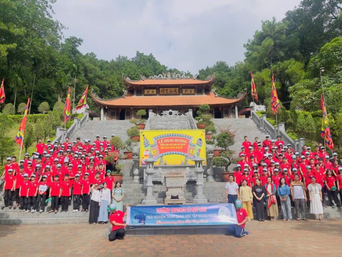 Đoàn trải nghiệm chụp ảnh lưu niệm trước Đền thờ thầy giáo Chu Văn An