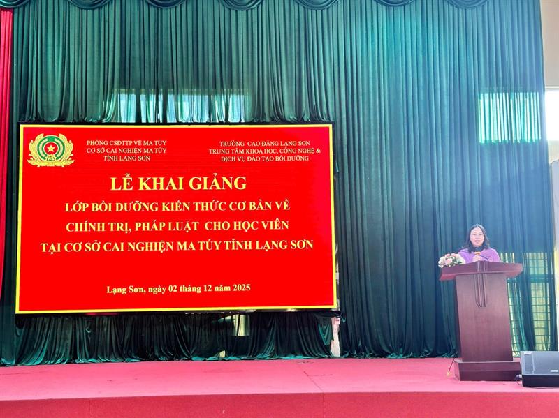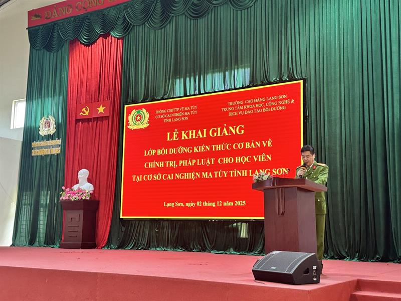 Ngày 02/12/2025, Phòng Cảnh sát điều tra tội phạm về ma túy Công an tỉnh Lạng Sơn phối hợp với Trường Cao đẳng Lạng Sơn tổ chức Lễ khai giảng Lớp bồi dưỡng kiến thức cơ bản về chính trị, pháp luật cho học viên đang cai nghiện ma túy tại Cơ sở cai nghiện ma túy tỉnh Lạng Sơn.