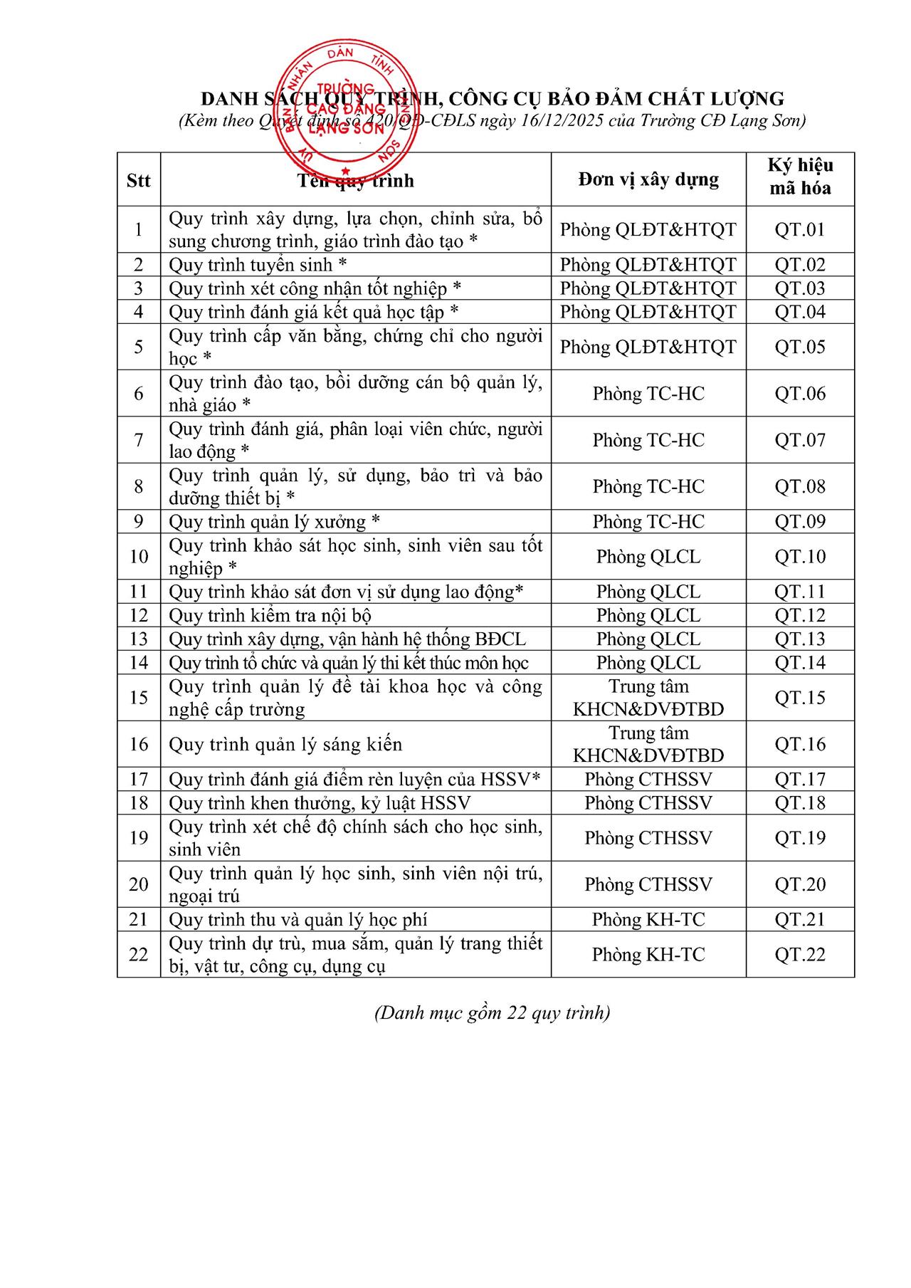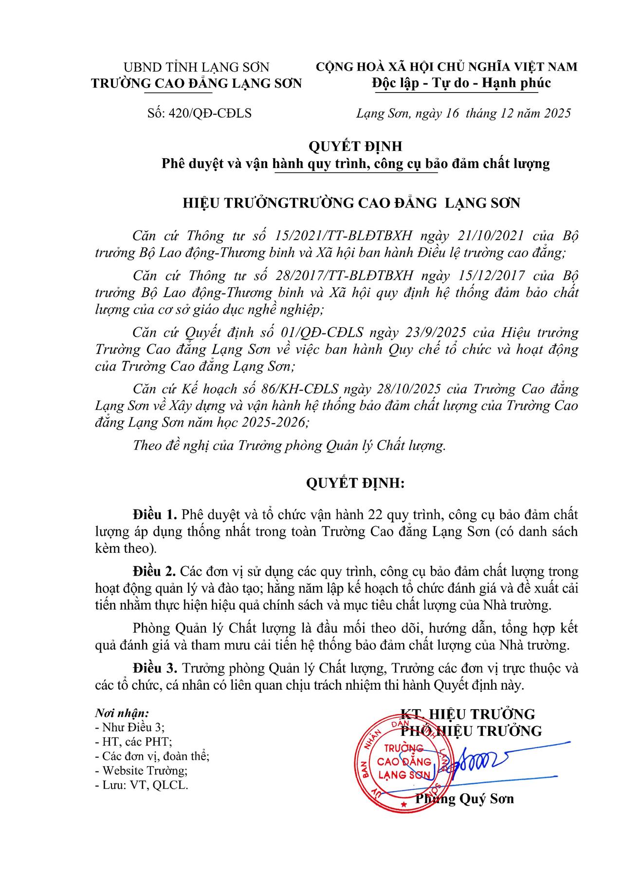 Tin mới Trường Cao đẳng Lạng Sơn tổ chức Hội nghị triển khai Khung năng lực số cho người học Tổ chức ngoại khóa chủ đề “Nâng cao năng lực số cho giáo viên, học sinh khối giáo dục thường xuyên” Chủ động xây dựng kế hoạch ôn luyện, Trường Cao đẳng Lạng Sơn đạt 09 giải tại Kỳ thi học sinh giỏi khối Giáo... Cuộc thi Sáng tạo dành cho thanh thiếu niên, nhi đồng tỉnh Lạng Sơn lần thứ 18 (năm 2026) Trường Cao đẳng Lạng Sơn tổ chức chương trình tham quan, trải nghiệm và hướng nghiệp cho học sinh Trường TH&THCS Tú Đoạn Trang chủ1. Văn bản đảm bảo chất lượng1.3. Nhà trường Phê duyệt và vận hành quy trình, công cụ bảo đảm chất lượng 23/04/2026 0 15 Chia sẻ FacebookXInCopy URL 22 QT công cụ BĐCL xây dựng năm 2025 BÌNH LUẬN Hủy trả lời Bình luận: Vui lòng nhập bình luận của bạn Tên:* Vui lòng nhập tên của bạn ở đây Email:* Bạn đã nhập một địa chỉ email không chính xác! Vui lòng nhập địa chỉ email của bạn ở đây Website: Lưu tên, email và trang web của tôi trong trình duyệt này cho lần tiếp theo tôi nhận xét. Δ Trường Cao đẳng Lạng Sơn tổ chức Hội nghị... 22/04/2026 Tổ chức ngoại khóa chủ đề “Nâng cao năng... 21/04/2026 Chủ động xây dựng kế hoạch ôn luyện, Trường... 21/04/2026 Cuộc thi Sáng tạo dành cho thanh thiếu niên,... 16/04/2026 Trường Cao đẳng Lạng Sơn tổ chức chương trình... 15/04/2026