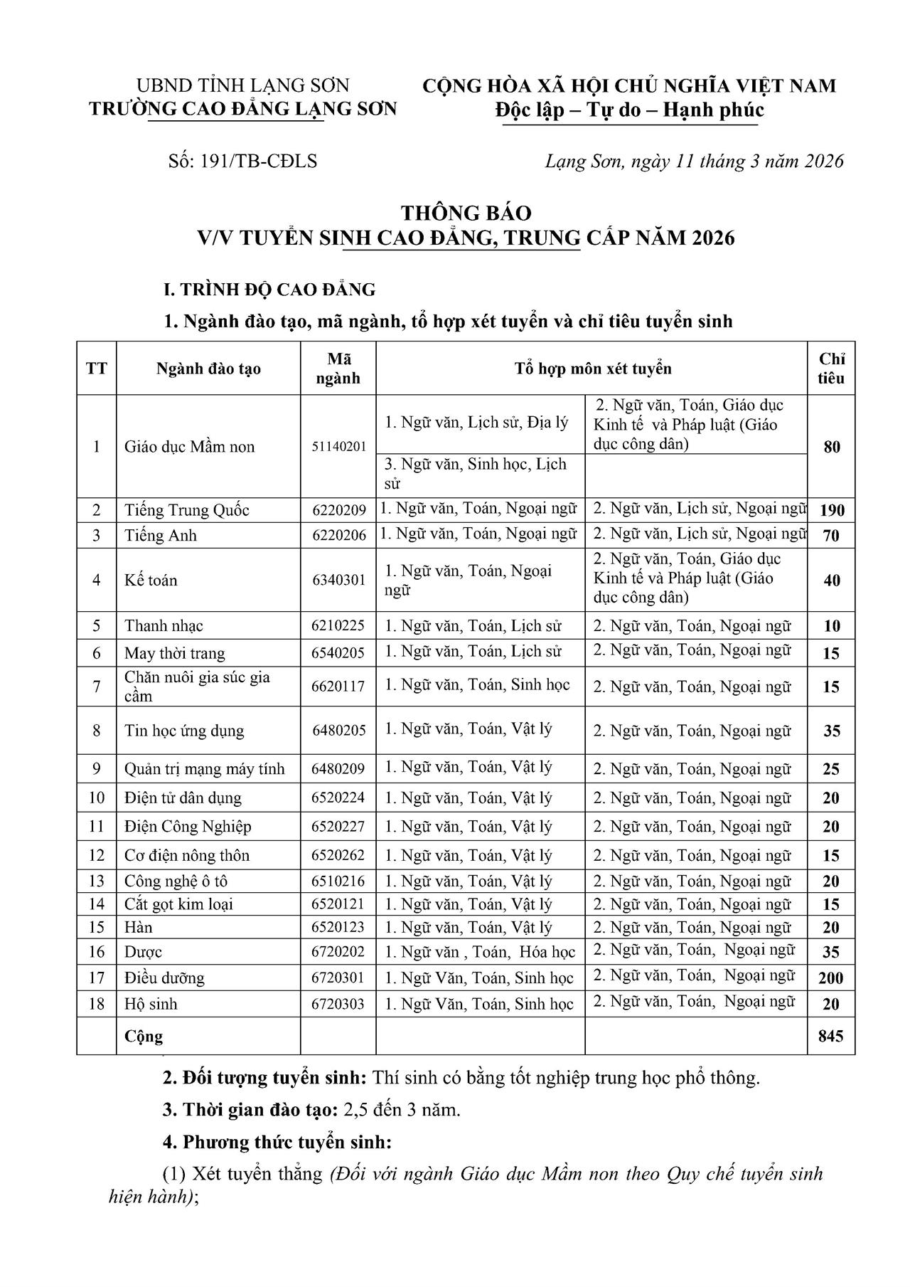 Tin mới TB191 – Trường CĐLS thông báo tuyển sinh 2026 Tăng cường kết nối doanh nghiệp: Công ty Cổ phần Phát triển Giáo dục Quốc tế Việt Phát Lạng Sơn tư vấn việc làm... Lễ phát động Tết trồng cây “Đời đời nhớ ơn Bác Hồ” và ra quân Tháng Thanh niên năm 2026 Lễ bế giảng lớp bồi dưỡng tiếng dân tộc Tày và tiếng dân tộc Hoa (tiếng Trung Quốc) cho cán bộ, chiến sĩ Công... Lãnh đạo Uỷ ban nhân dân tỉnh thăm, chúc tết và kiểm tra công tác chuẩn bị Tết Nguyên đán tại Trường Cao đẳng... Trang chủTuyển sinhTuyển sinh 2026 TB191 – Trường CĐLS thông báo tuyển sinh 2026 17/03/2026 0 115 Chia sẻ FacebookXInCopy URL BÌNH LUẬN Hủy trả lời Bình luận: Vui lòng nhập bình luận của bạn Tên:* Vui lòng nhập tên của bạn ở đây Email:* Bạn đã nhập một địa chỉ email không chính xác! Vui lòng nhập địa chỉ email của bạn ở đây Website: Lưu tên, email và trang web của tôi trong trình duyệt này cho lần tiếp theo tôi nhận xét. Δ Tăng cường kết nối doanh nghiệp: Công ty Cổ... 16/03/2026 Lễ phát động Tết trồng cây “Đời đời nhớ... 04/03/2026 Lễ bế giảng lớp bồi dưỡng tiếng dân tộc... 16/02/2026 Lãnh đạo Uỷ ban nhân dân tỉnh thăm, chúc... 13/02/2026 Trường Cao đẳng Lạng Sơn tổ chức Hội nghị... 13/02/2026