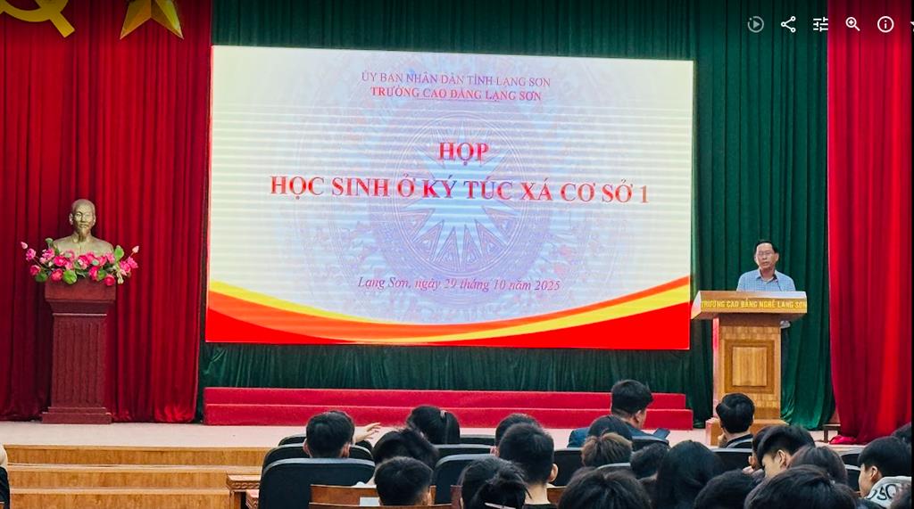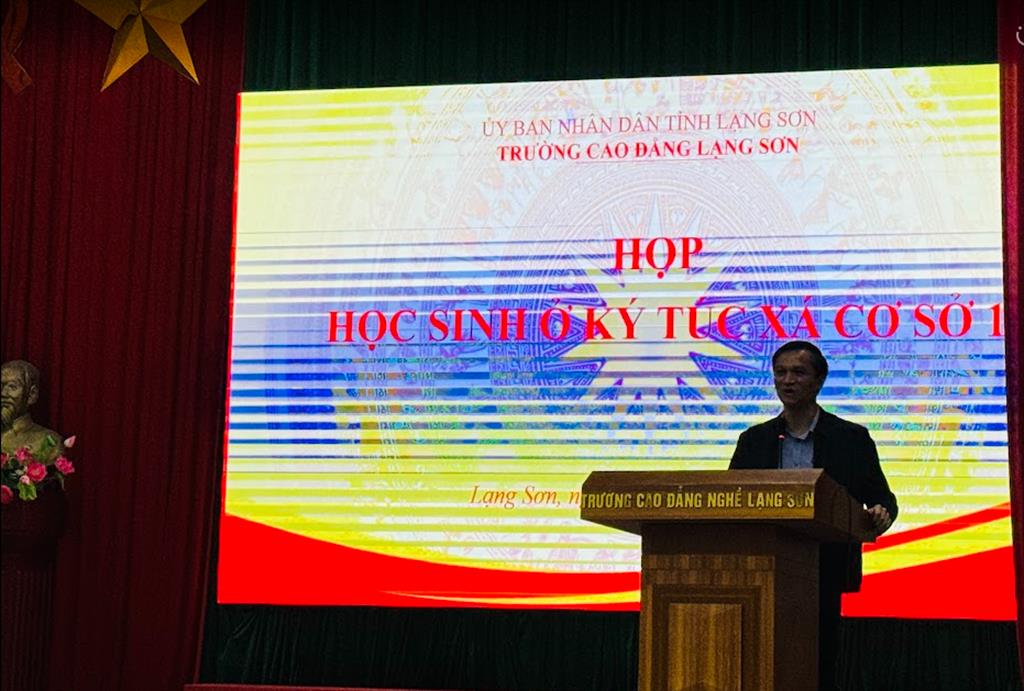 Thực hiện Kế hoạch năm học 2025–2026, vào hồi 19h30 ngày 29/10/2025, tại Hội trường H1 – Cơ sở 1, Trường Cao đẳng Lạng Sơn, Phòng Công tác Học sinh – Sinh viên phối hợp với Ban Quản lý Ký túc xá cơ sở 1 tổ chức cuộc họp học sinh, sinh viên nội trú. Tham dự cuộc họp có đại diện Ban Giám hiệu Nhà trường, lãnh đạo Phòng Công tác HSSV, Ban Quản lý KTX cơ sở 1, giáo viên chủ nhiệm các lớp có HSSV ở nội trú, cùng đông đảo học sinh, sinh viên đang ở tại KTX cơ sở 1.