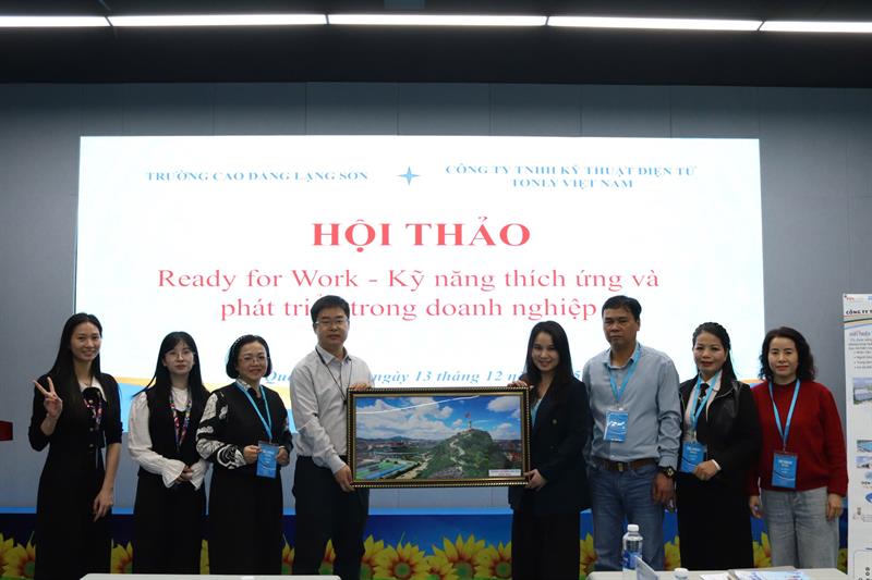 Đoàn công tác Nhà trường tặng quà và chụp ảnh cùng Ban Lãnh đạo Công ty TNHH Kỹ thuật điện tử Tonly Việt Nam