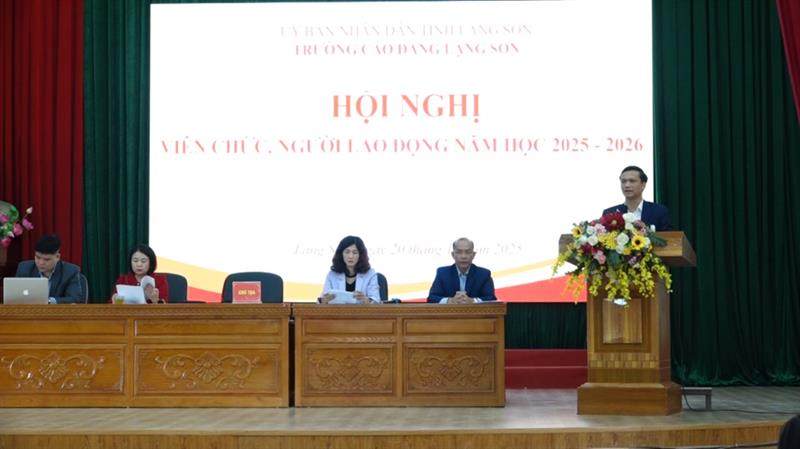 Hội nghị đã được nghe Báo cáo tổng kết thực hiện Nghị quyết hội nghị viên chức, người lao động năm học 2024-2025 và phương hướng nhiệm vụ trọng tâm công tác năm học 2025-2026 do đồng chí Trịnh Thị Xuân Quỳnh-Phó Hiệu trưởng trình bày. Báo cáo đã nêu rõ năm học 2024-2025 diễn ra trong bối cảnh các trường cao đẳng trên địa bàn tỉnh Lạng Sơn thực hiện đồng thời nhiều nhiệm vụ quan trọng: duy trì ổn định hoạt động đào tạo; nâng cao chất lượng giáo dục nghề nghiệp; triển khai các chủ trương lớn của Đảng, Nhà nước về sắp xếp, tinh gọn tổ chức bộ máy, trong đó có việc xây dựng và phối hợp thực hiện Đề án sáp nhập Trường Cao đẳng Nghề Lạng Sơn, Trường Cao đẳng Y tế Lạng Sơn vào Trường Cao đẳng Sư phạm và đổi tên thành Trường Cao đẳng Lạng Sơn.