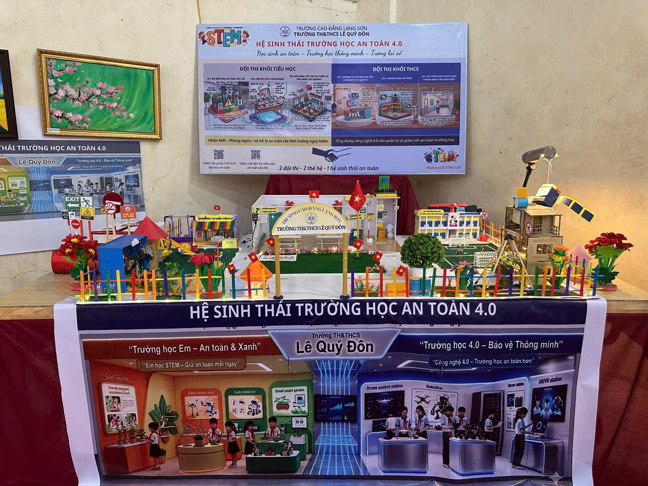 Dưới sự hướng dẫn của các thầy cô giáo, đội Tiểu học Trường TH&THCS Lê Quý Đôn mang đến Ngày hội ba sản phẩm STEM thiết thực, được sáng tạo từ vật liệu tái chế. Đó là bộ biển báo an toàn, làm từ bìa carton, ống nhựa, chai nhựa cũ, giúp học sinh nhận biết các khu vực nguy hiểm và ghi nhớ quy tắc an toàn một cách trực quan; hộp sơ cứu thông minh với thiết kế ba ngăn khoa học, trang bị các dụng cụ y tế cơ bản, hỗ trợ xử lý nhanh các tình huống trầy xước, va chạm nhẹ tại lớp học; và mô hình “Lớp học an toàn 4.0” – điểm nhấn nổi bật với thiết kế 3D tích hợp cảm biến khói, nút báo động khẩn cấp, đèn năng lượng mặt trời và mã QR hướng dẫn kỹ năng thoát hiểm.Bên cạnh đó, các em còn bổ sung nhiều mô hình phụ trợ như phòng tư vấn tâm lý học đường, khu dịch vụ và sân chơi, góp phần làm phong phú và sinh động không gian trưng bày.